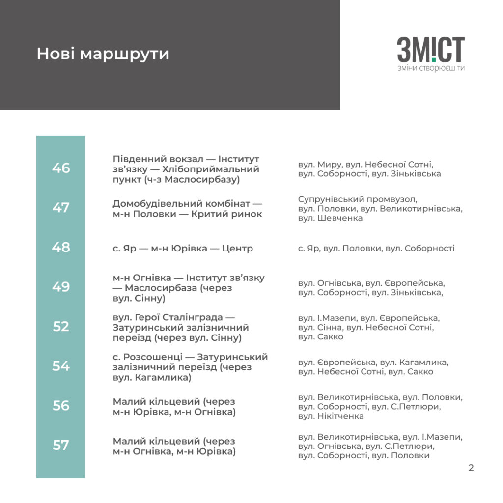 Номери тролейбусів і напрямок маршрутів не змінилися і залишилися в діапазоні від 1 до 15, а для автобусів та маршруток відвели номери від 21 до 58. Після набуття чинності змін громадський транспорт Полтави матиме 38 маршрутів замість 57 колишніх.