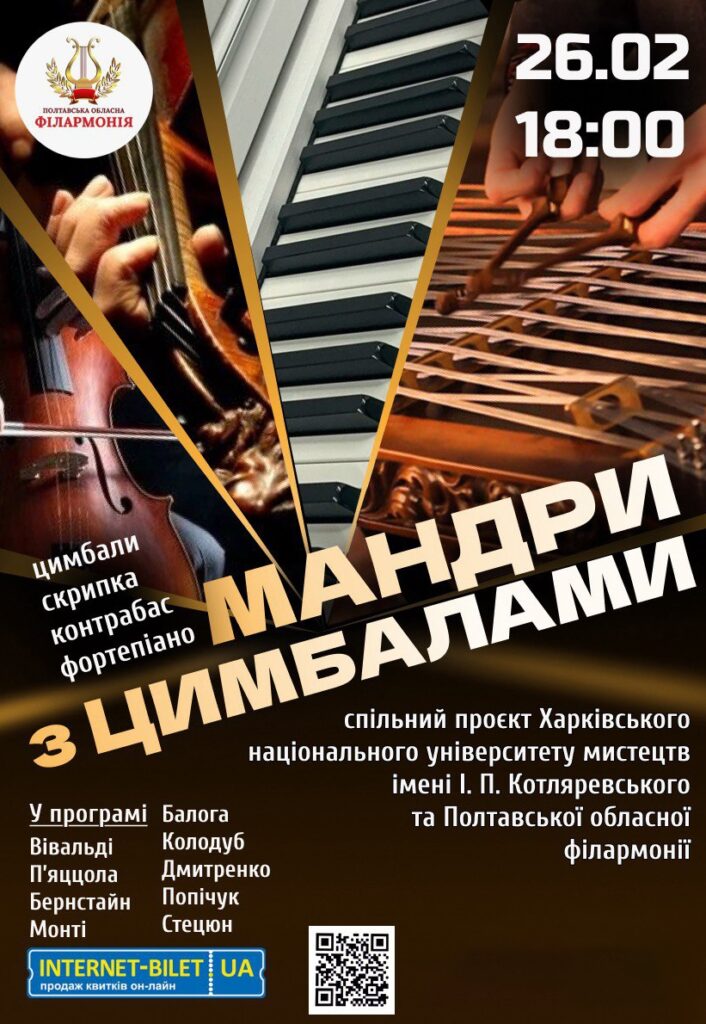 У програмі – музика для соло і ансамблів. Звучатимуть твори Вівальді, Пʼяццоли, Бернстайна, Колодуба, Монті, Балога, Стецюна, Дмитренка, Попічука. Концерт у виконанні цимбалістів та ансамблю з Харківського національного університету мистецтв імені Котляревського.