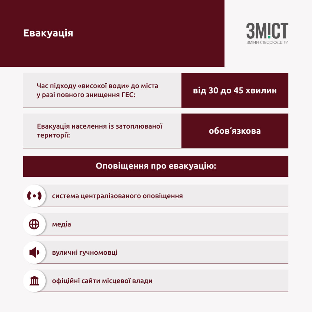 У разі сильного обстрілу й повного руйнування ГЕС, є план евакуації місцевих й закріплені Збірні пункти. Якщо люди не встигнуть евакуюватись, необхідно піднятися на вищі поверхи (вище 2-го поверху) своїх або найближчих будинків та очікувати сходу «високої води» або рятувальників.