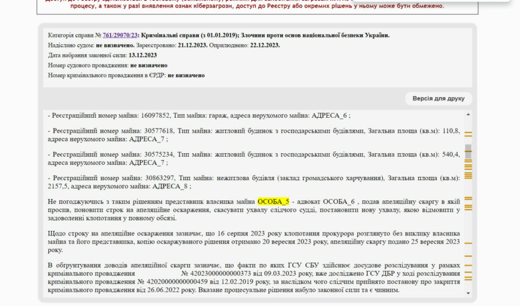 Верига хоче скасувати арешт на ресторан, квартиру, будинок, гараж, машиномісце тощо. Його адвокат просив поновити строк на апеляційне оскарження, скасувати ухвалу слідчого судді й зняти арешт з майна.