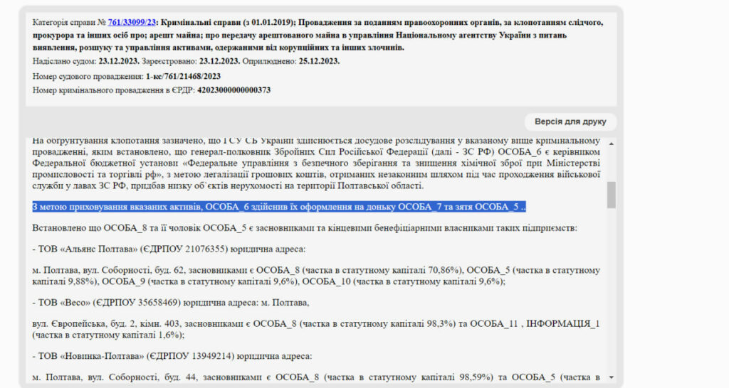 Прокурор вказав, що майно арештували, бо його кінцевим власником є генерал Капашин – керівник Федеральної бюджетної установи у росії. За наявними оперативними даними, саме він придбав низку об`єктів на Полтавщині, щоб відмивати гроші. Задля приховування активів, подружжя Вериг записали засновниками юридичних осіб. У 2021 році вони виїхали з України і отримали російське громадянство, йдеться в ухвалі суду.