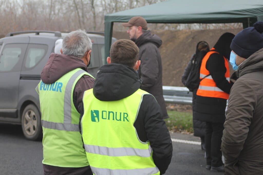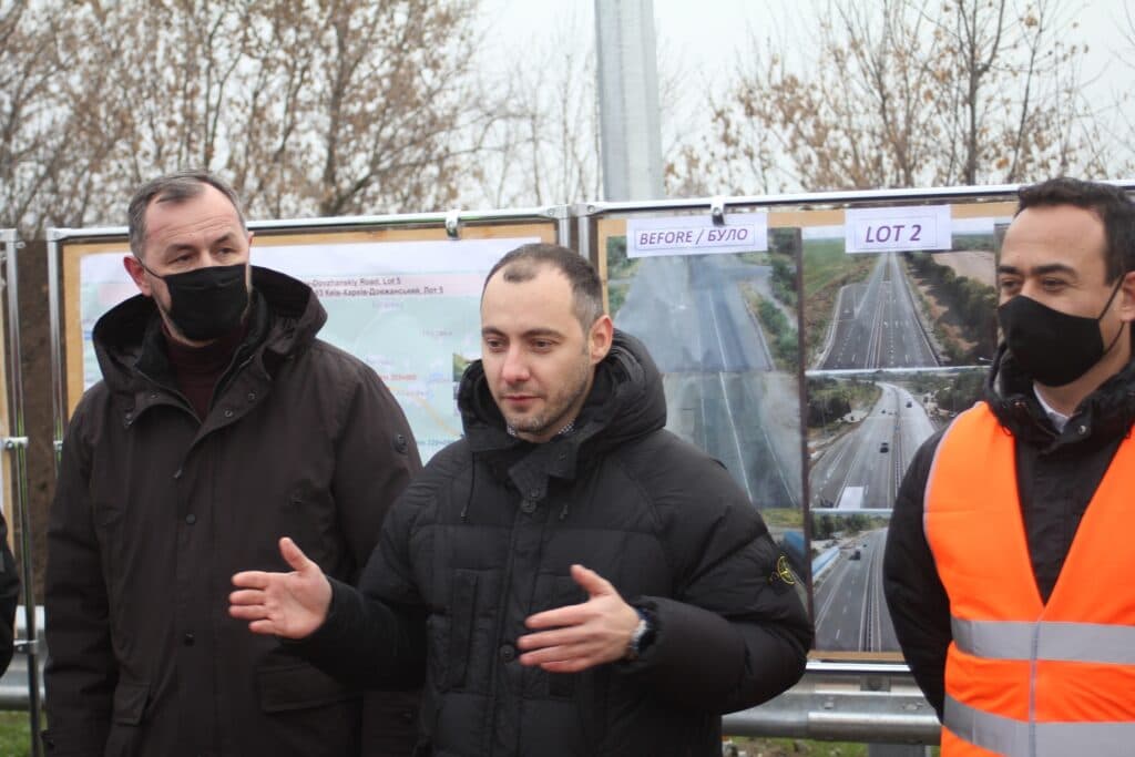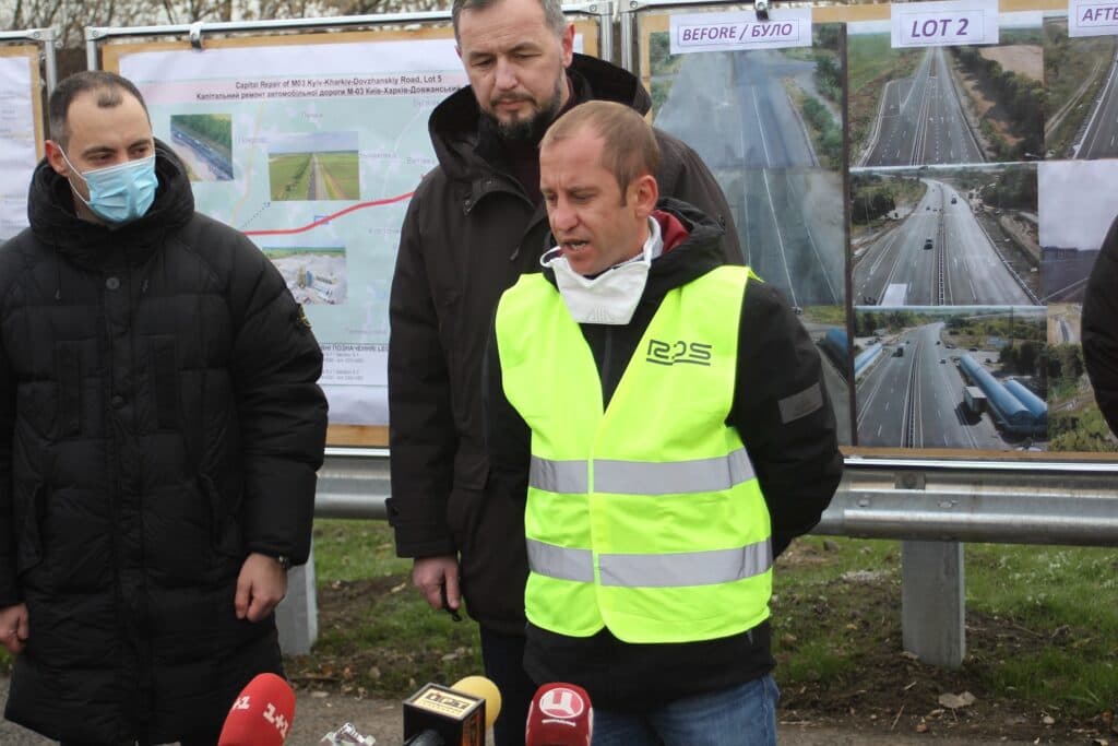 У помаранчевому жилеті на відновленій дорозі – керівник проєкту від компанії Onur – Озгюр Оздоган, а у зеленому жилеті Дмитро Ходякевич, керівник проєкту від компанії «Ростдорстрой».