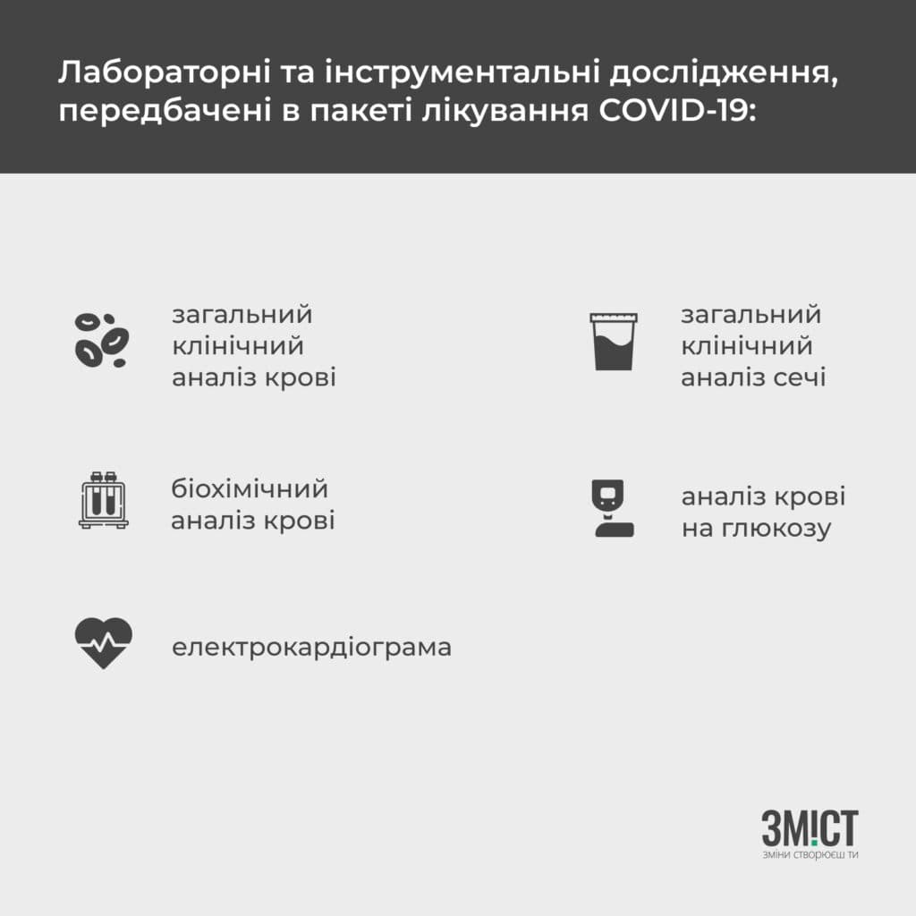 Також пакет стаціонарної допомоги для хворих на COVID-19 передбачає моніторинг стану здоров’я пацієнта та корекцію лікування, цілодобовий лікарський та медсестринський догляд, консультації лікарів інших спеціальностей, заходи з профілактики загальних ускладнень та вторинної профілактики супутніх захворювань.