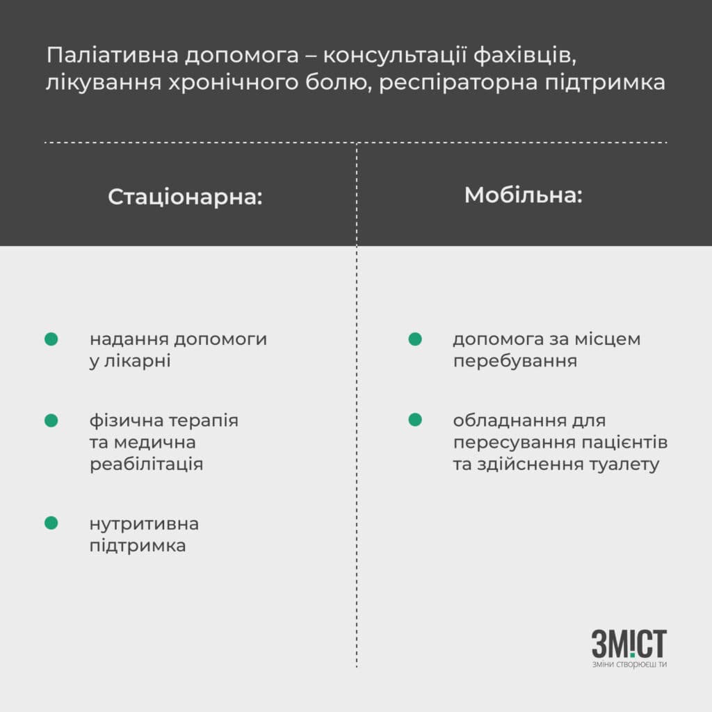 Також пацієнти можуть отримати безкоштовну паліативну допомогу вдома. Для цього передбачений пакет «Мобільна паліативна медична допомога дорослим і дітям» з наступними послугами: