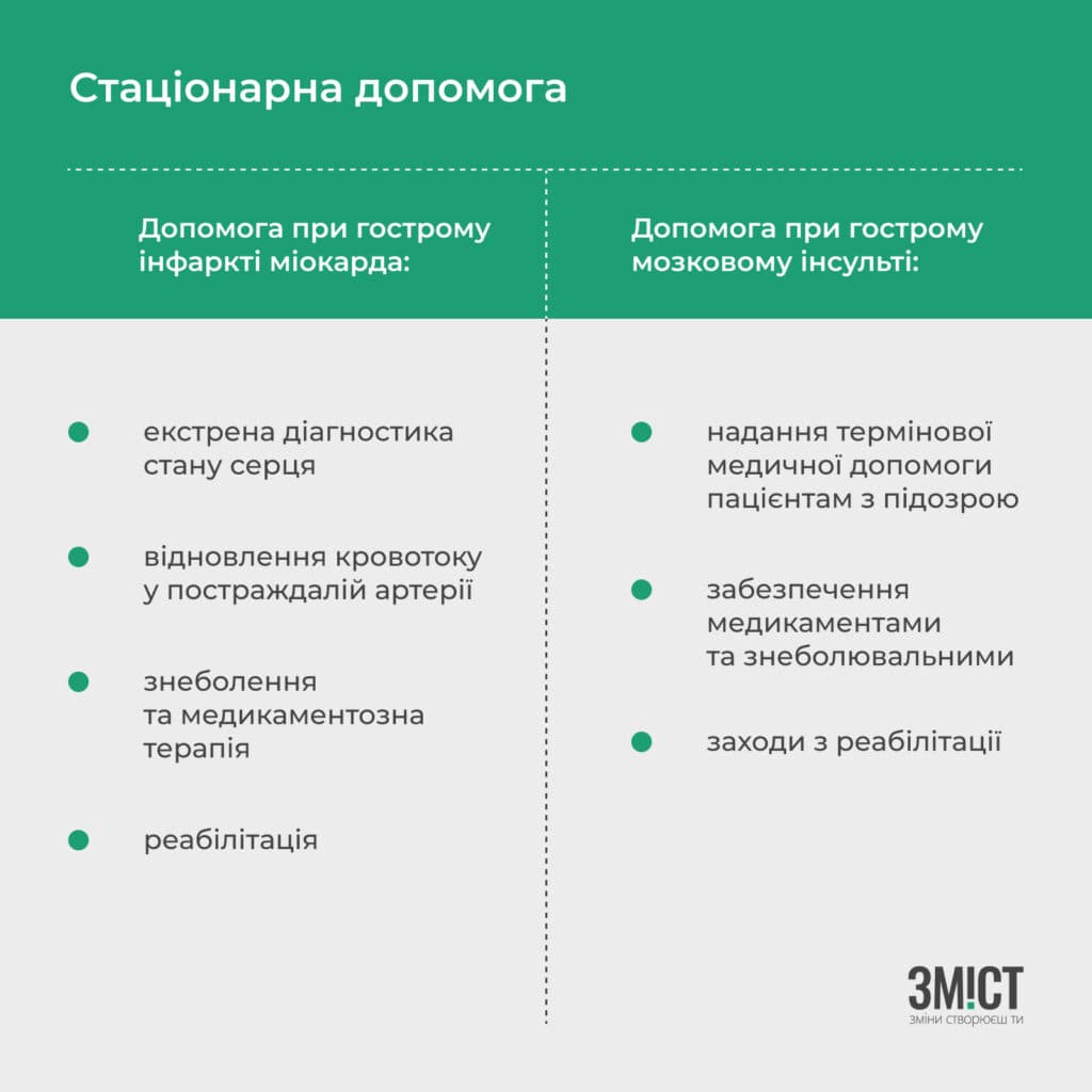 У межах пакету безкоштовними для пацієнта є дослідження, забезпечення цілодобового лікарського та медсестринського догляду, забезпечення знеболення та медикаментозної терапії, проведення консультацій лікарями, надання послуг з медичної реабілітації в гострому періоді для запобігання виникнення ускладнень, забезпечення доступу до спеціалізованої допомоги.