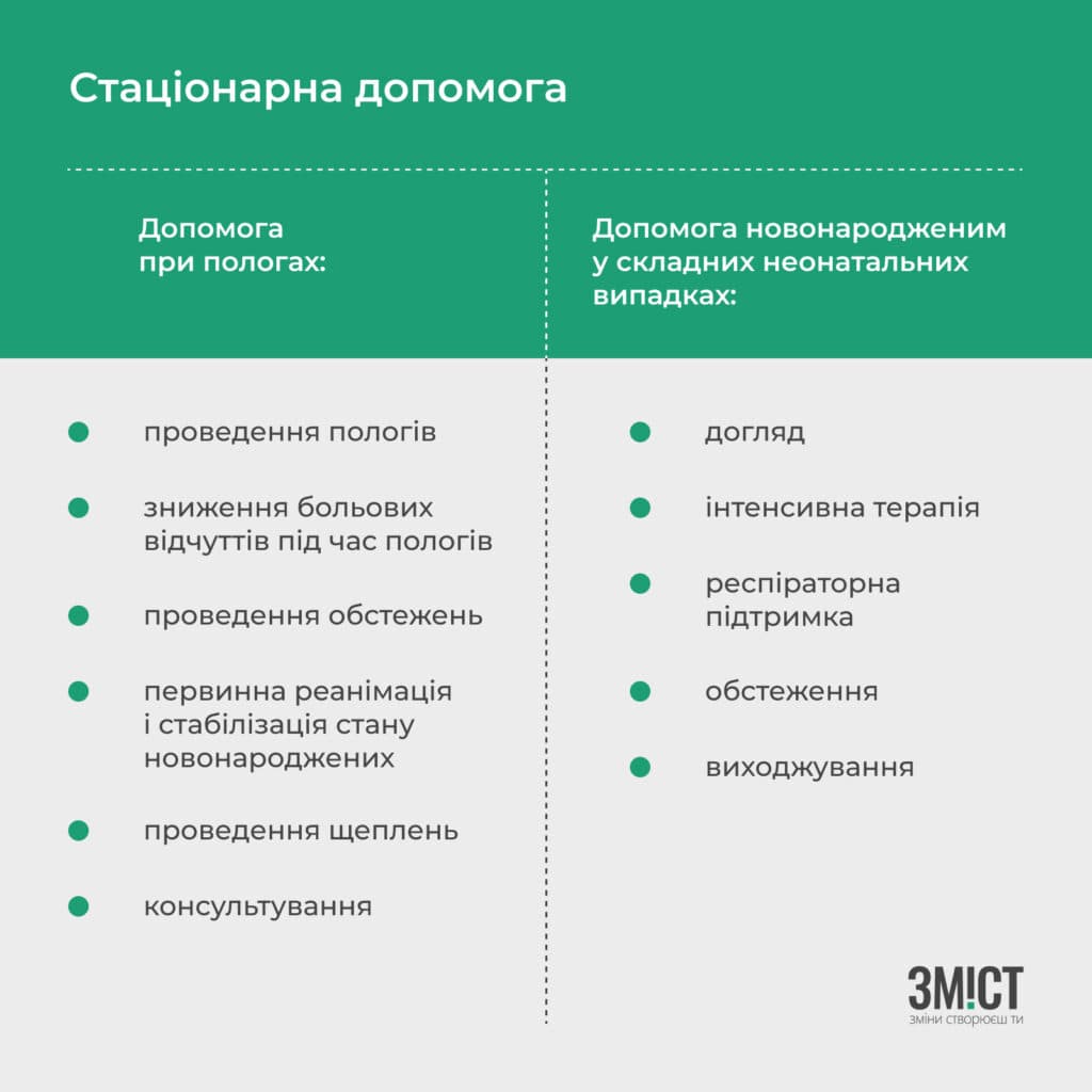 Пакет «Медична допомога при пологах» передбачає проведення інструментальних пологів чи кесаревого розтину, зниження больових відчуттів у жінки під час пологів. У лікарні мають цілодобово обстежувати пацієнтку, проводити інтенсивну терапію якщо є загроза життю та виконувати заходів з первинної реанімації та стабілізації стану новонароджених. Також новонародженим та породіллям проводять щеплення, консультують про грудне вигодовування і післяпологову контрацепцію.