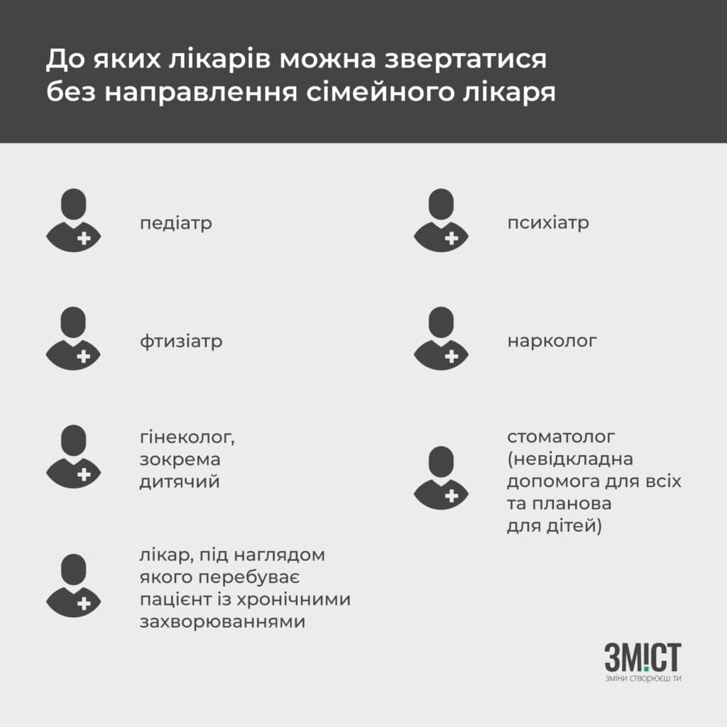 За підсумком консультації з сімейним лікарем пацієнт у разі потреби може отримати направлення до вузького спеціаліста. Є випадки, коли пацієнт може звернутися одразу до вузьких фахівців. Цей візит оплатить НСЗУ.