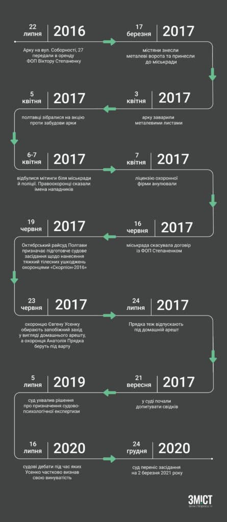 У 2017 році, 5 квітня, охоронці фірми «Скорпіон-2016» Прядко й Усенко нанесли тяжкі тілесні ушкодження полтавцям Олександру Кобі та Дмитру Юденку після того, як у центрі міста на вул. Соборності, 27 полтавці зібралися на акцію проти забудови арки «Газетний ряд».