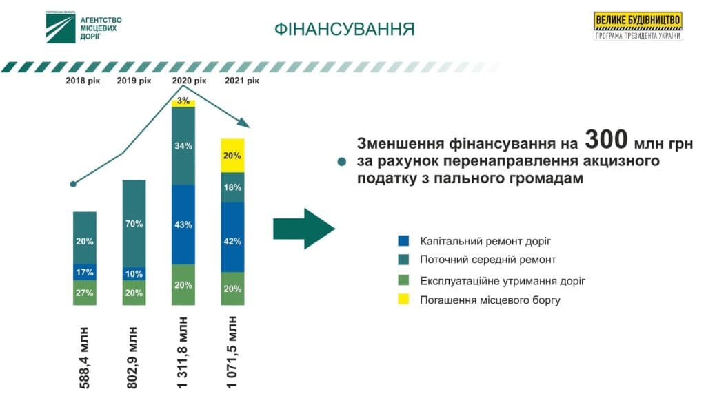 У 2021 році фінансування Агентства на утримання та ремонт доріг становить 1 млрд 71 млн грн: