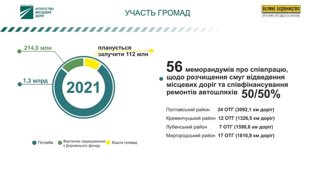 У Полтавській області утворили 60 територіальних громад. 56 з них підписали з Агентством меморандум про співпрацю, щодо розчищення смуг відведення місцевих доріг та співфінансування ремонтів автошляхів 50/50%: