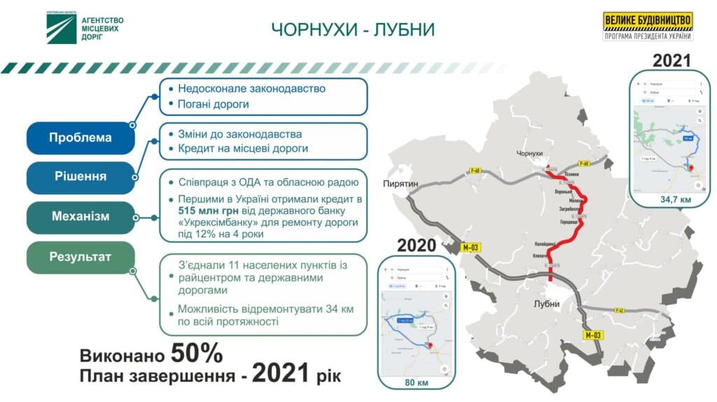 - Чорнухи-Лубни – 28,9 км завершення ремонту за кредитні кошти;