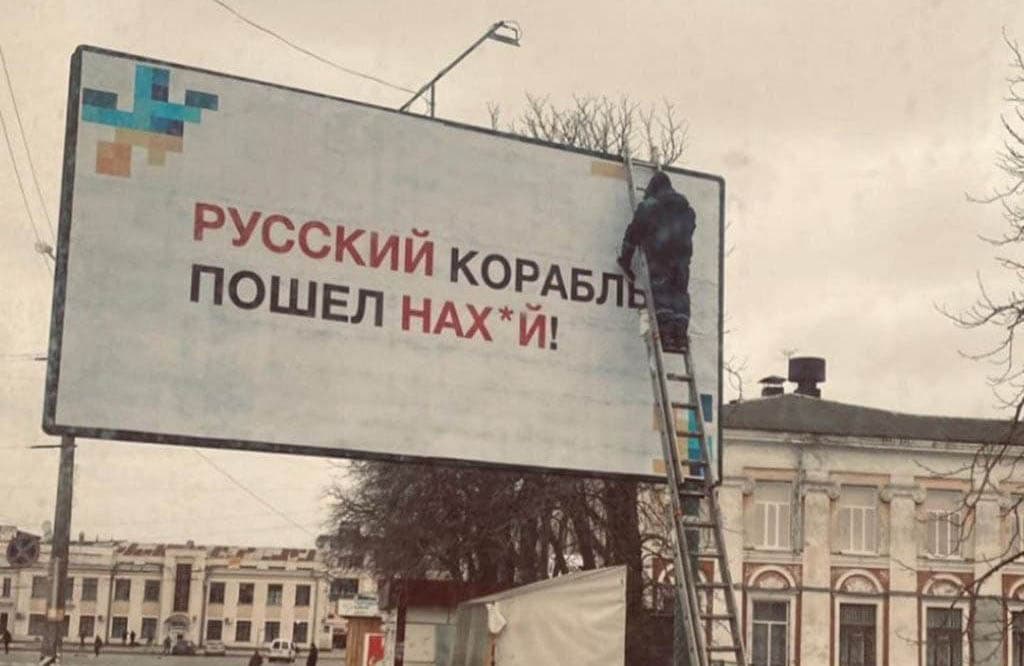 У Полтаві та інших містах області на бігбордах використовують послання українських військових на острові Зміїному окупантам «Русский военный корабль, иди нахуй», щоб показати що їх тут не чекають.
