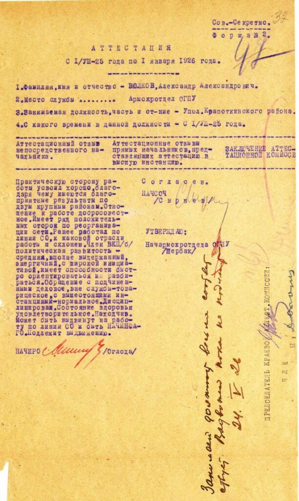 За висновком атестації 1926 року Волкова визнали сумлінним і винахідливим працівником з середньою «політичною розвиненістю», діловим ставленням до підлеглих та здатністю до ініціативи й швидкого орієнтування. Загалом – придатним до просування в системі. Інші атестації здебільшого підтверджували цю характеристику.