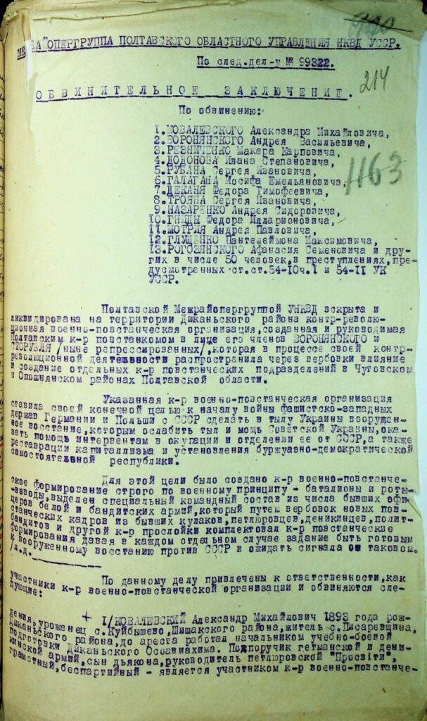 «У Карлівці арештували Окінського, якого Платонов забрав у Полтаву й слідство в його справі вів Каганович. Після першого ж допиту і застосування побиття, Каганович приніс протокол, підписаний арештованим, з якого було видно, що Окінський – керівник районної комендатури “ПОВ” у Карлівці, і що організував цілий ряд бойових груп і назвав низку прізвищ по району [а також] в інших областях України, як членів “ПОВ”. Насправді вони були тільки його знайомими. У цій справі дуже багато чесних, невинних людей», – розповідав Волков на допиті.