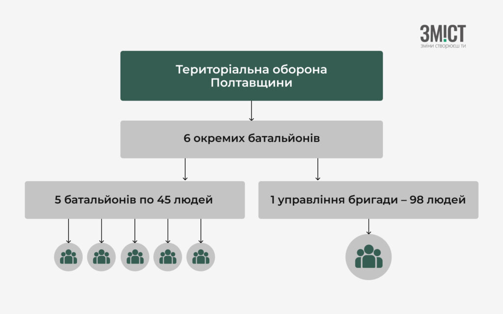 Батальйони територіальної оборони в області дислокуються у Полтаві, Кременчуці, Миргороді та Лубнах. Військовослужбовці служитимуть за місцем проживання.