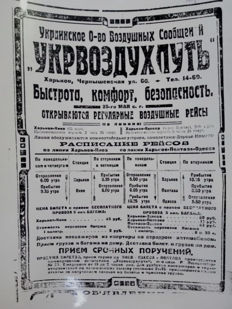 ЗМІСТ раніше розповідав, що рішення про відкриття повітряної бази «Укрвітряшлях» ухвалило в липні 1923 року. На будівництво виділили 150 десятин землі поблизу Київського вокзалу. Так, вже 25 травня 1924 року о 9:00 літак «Червоний хімік» полетів рейсом Харків-Полтава-Київ з чотирма журналістами – першими пасажирами літака. У перший рік роботи аеродром приймав вдень від одного до двох пасажирських літаків на чотири місця.