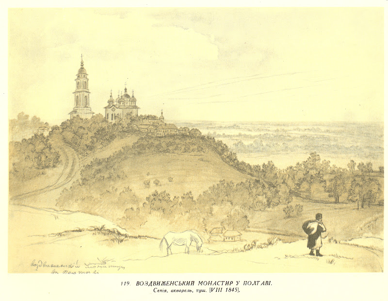 Восени 1845 року Тарас Шевченко створив малюнок Воздвиженського монастиря, на якому також можна розгледіти поодинокі двори місцевих селян. Його приїзд до Полтавщини був пов'язаний із завданням Київської археологічної комісії – Шевченко описував церкви, начиння та археологічні пам'ятки регіону. Згодом мандрівка відбилася в повісті «Близнюки». У тексті згадується монастир та його підніжжя:
