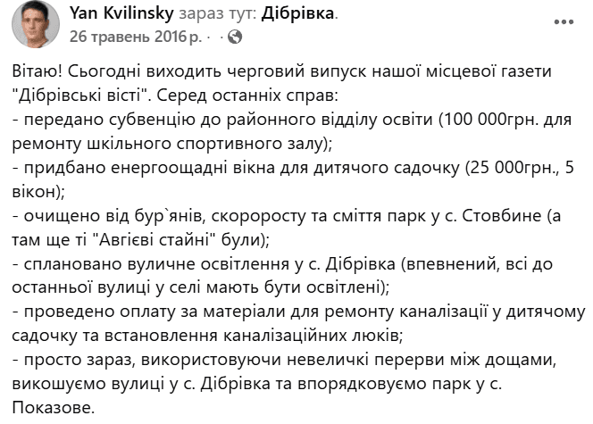 Школу, дитсадок і амбулаторію в Дібрівці відремонтували. З ініціативи молодіжної ради в селі облаштували вуличний кінотеатр. Сільрада ухвалила програму поводження з відходами. Учасникам бойових дій виділили земельні ділянки, за документацію для яких сплатила громада. Цей перелік справ можна розширювати, проте й уже наведений засвідчує масштаб роботи, яку встиг завершити Ян Квілінський за п’ять років.