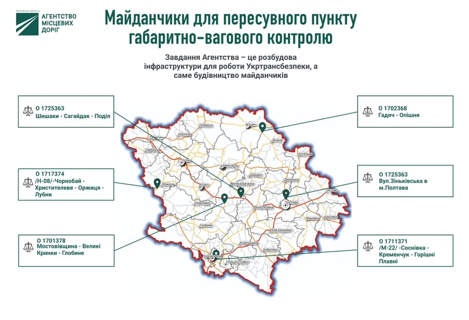 В області побудували 6 майданчиків для зважування великовагових транспортних засобів. Система автоматично зчитує номерний знак транспорту, його масу, швидкість руху, розміри тощо. Агентство не штрафує за порушення ваги. Усі дані передаються до Державної служби України з безпеки на транспорті. Складає протоколи та накладає штрафи поліція та «Укртрансбезпека».