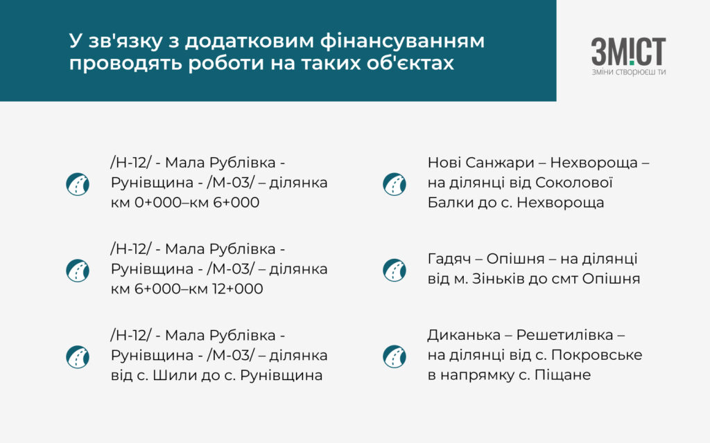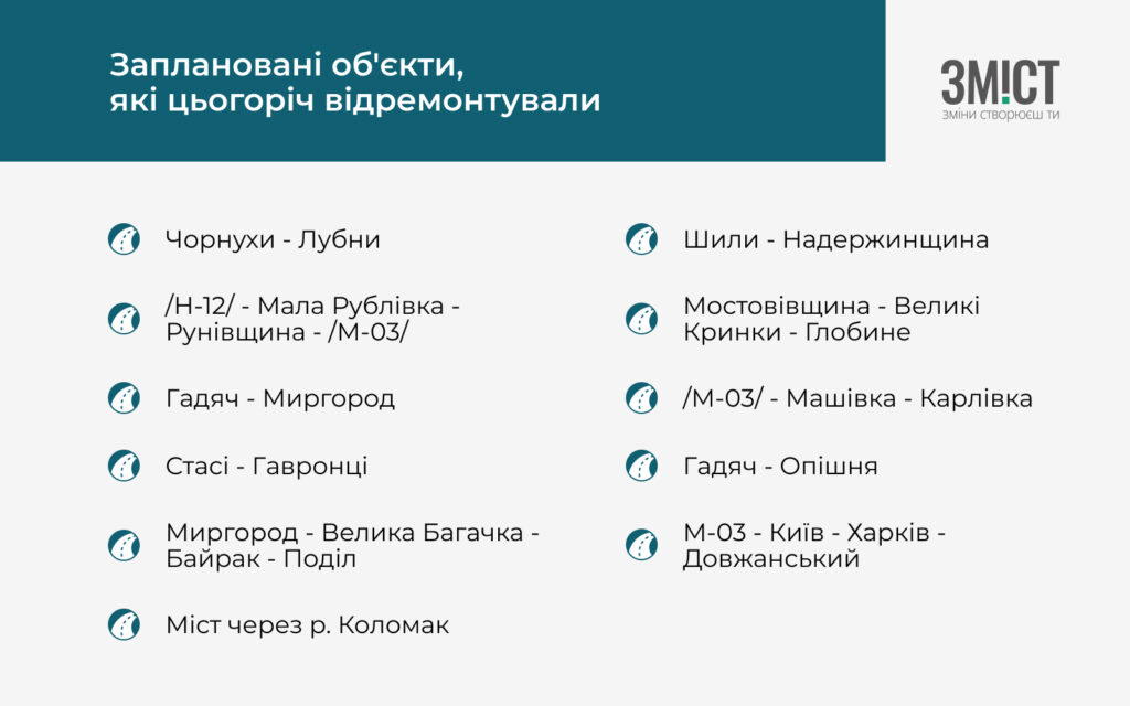 Наймасштабнішим об’єктом є капітальний ремонт дороги Лубни – Чорнухи. За рік відновили майже 35 км дороги за кредитні кошти.