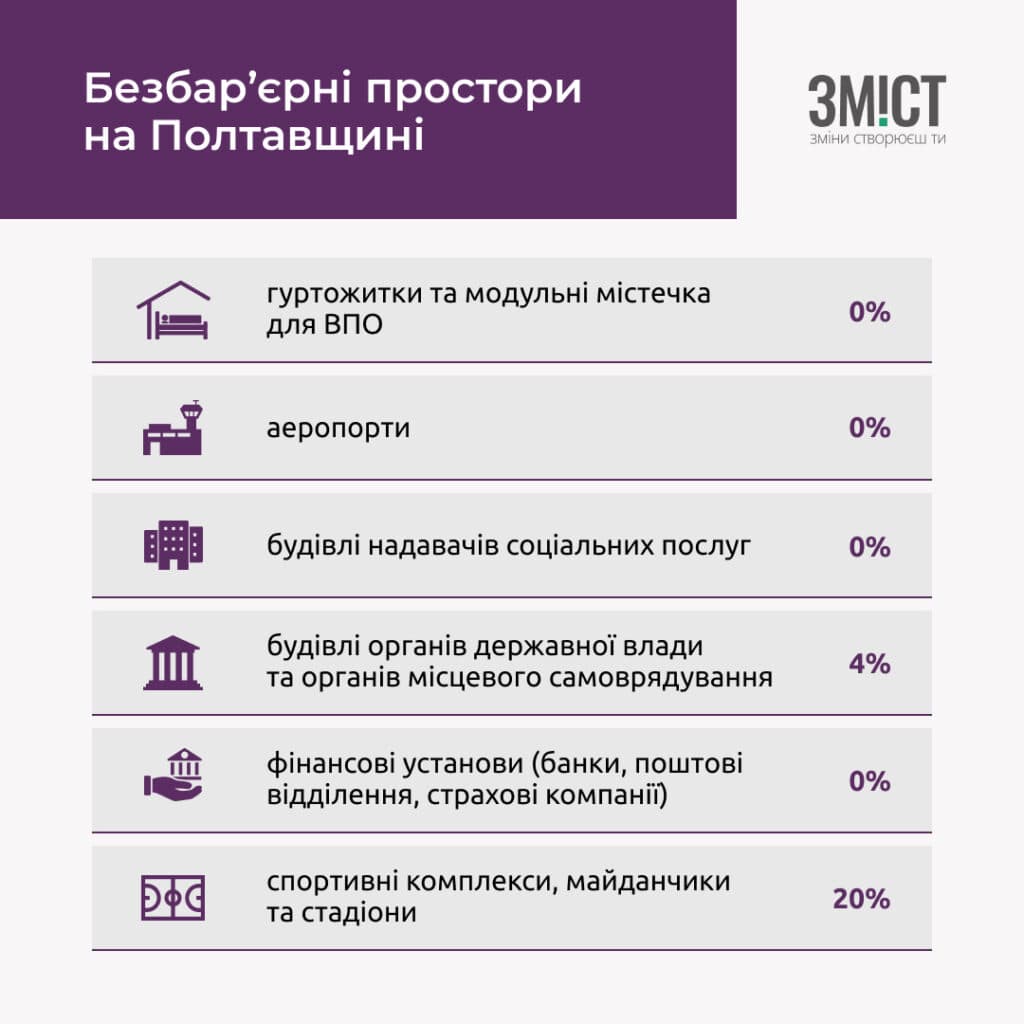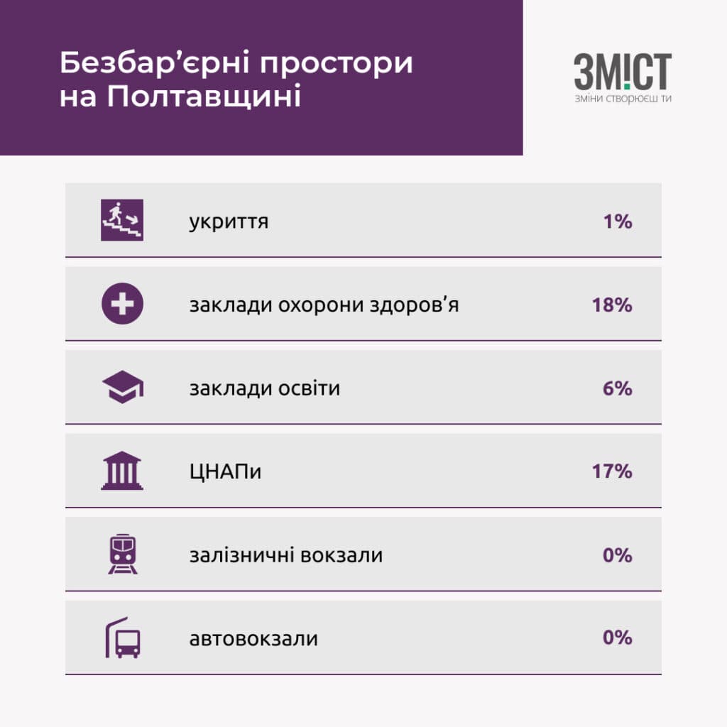 Найбільш недоступними для людей з інвалідністю, які мешкають на Полтавщині, стали залізничні вокзали та автовокзали, гуртожитки та модульні містечка для ВПО, будівлі надавачів соцпослуг та фінансові установи. Натомість найбільш зручними визнали спорткомплекси, стадіони, заклади охорони здоров’я та ЦНАПи.