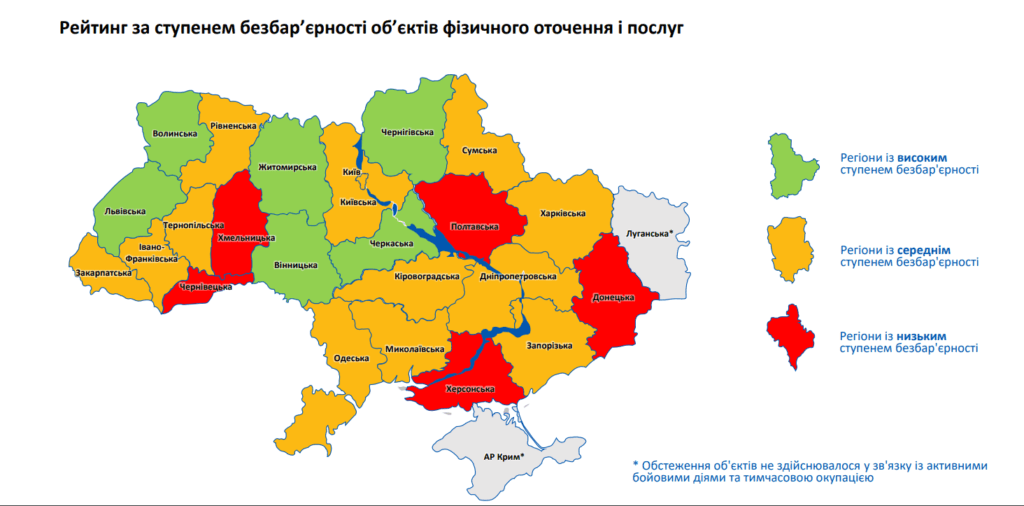 Ступінь безбар’єрності у різних областях України у 2023 році дослідили у Міністерстві відновлення, розвитку громад, територій та інфраструктури України. Фахівці проаналізували доступність понад 50 тис. об’єктів, серед яких – укриття, заклади охорони здоров’я та освіти, фінустанови, місця проживання ВПО, вокзали тощо. Вони встановили, що 22% просторів – безбар’єрні, 32,1% – частково безбар’єрні, а 45,9% – повністю бар’єрні.