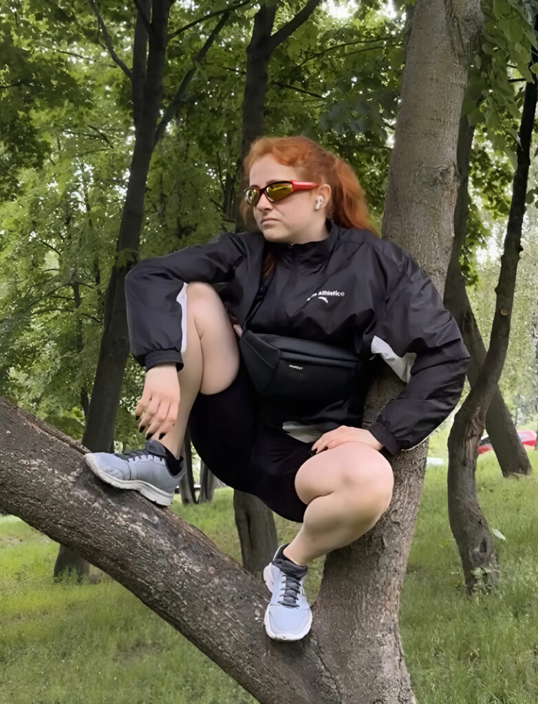 Для киян рутинна прогулянка з собакою о 7 ранку може стати значно цікавішою, якщо натрапити на рудоволосу блогерку під час зйомки нового відео. Дівчина у спортивному костюмі й окулярах переважно виконує вправи на турніках, проте здатна перетворити на тренувальний снаряд будь-який вуличний предмет: лави, сходи, дерева, елементи дитячого майданчика. Іронічний аудіосупровід довершує композицію відео блогерки: