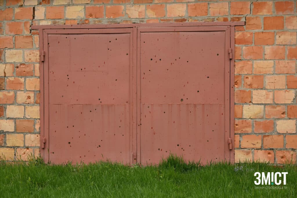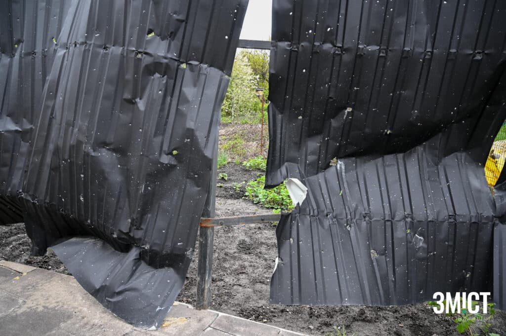 На деяких парканах та воротах видно отвори від осколків ворожої ракети, які розліталися на декілька метрів.