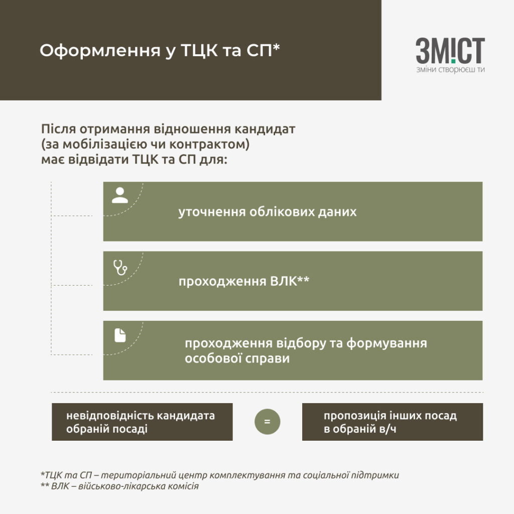 «Є перелік військових частин, їх зараз 76. Це перелік пріоритетного комплектування, який щомісяця переглядається. У цих частинах людина так само може обрати посаду, отримати рекомендаційний лист і мобілізуватися без підписання контракту в конкретну в/ч. Це спрямовано на те, щоб уникнути цих непорозумінь».