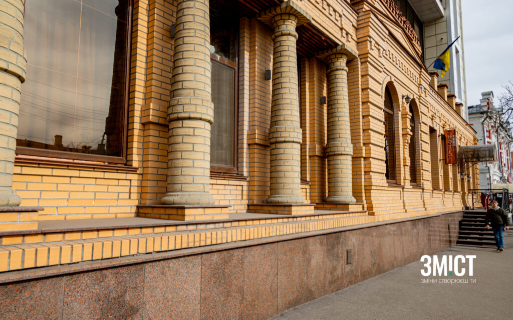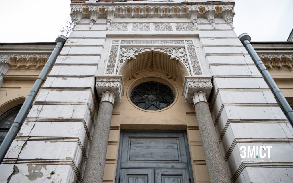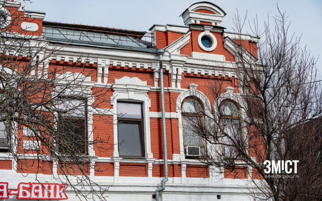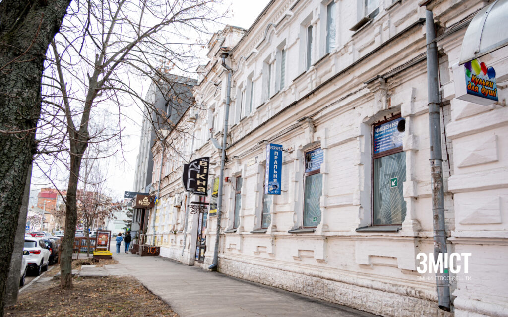 «Будинок прикрашений дерев’яними колонами. Колись їх було шість, зараз залишилося всього чотири. В табелі будинків ця будівля значиться за двома адресами – по колишній вулиці Петровській та по колишній Дворянській», – говорить Олександр Лимар.