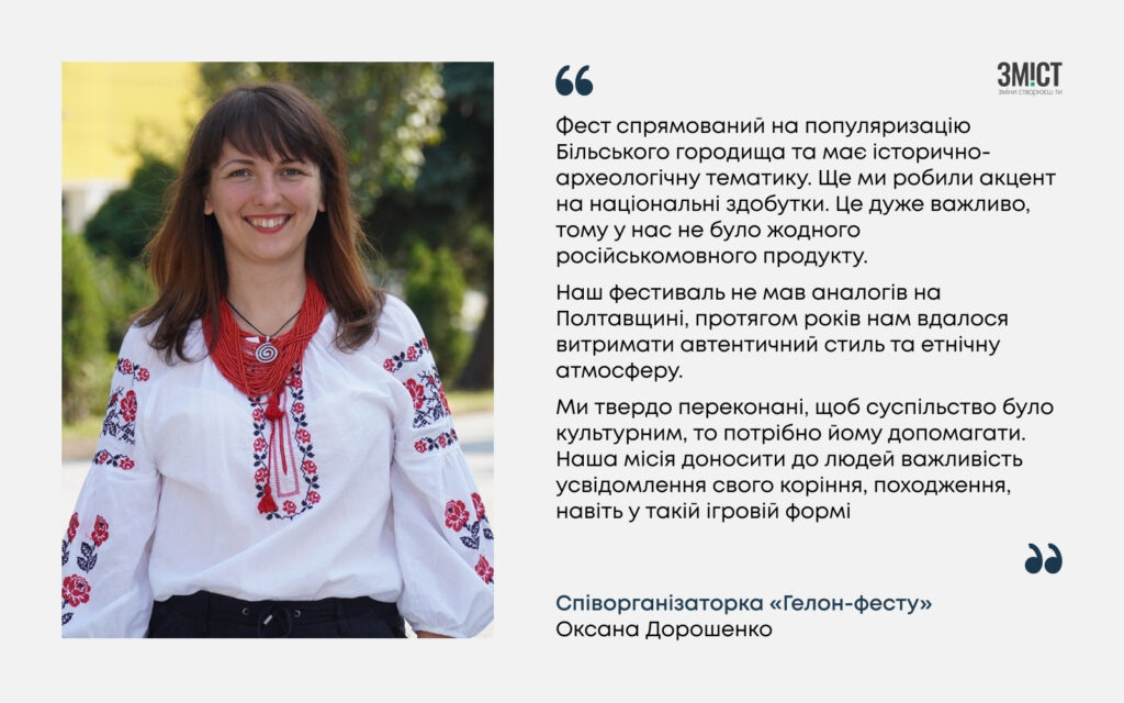 «Враховуючи те, що місто Гелон було торговельним центром з розвиненим гончарством, ткацтвом та ковальством, усе хотілося показати. У нас були локації з кінним шоу, стрільбою з лука, майстрів ремесел. Люди могли зануритися в атмосферу, щоб подивитися, як це все відбувається».