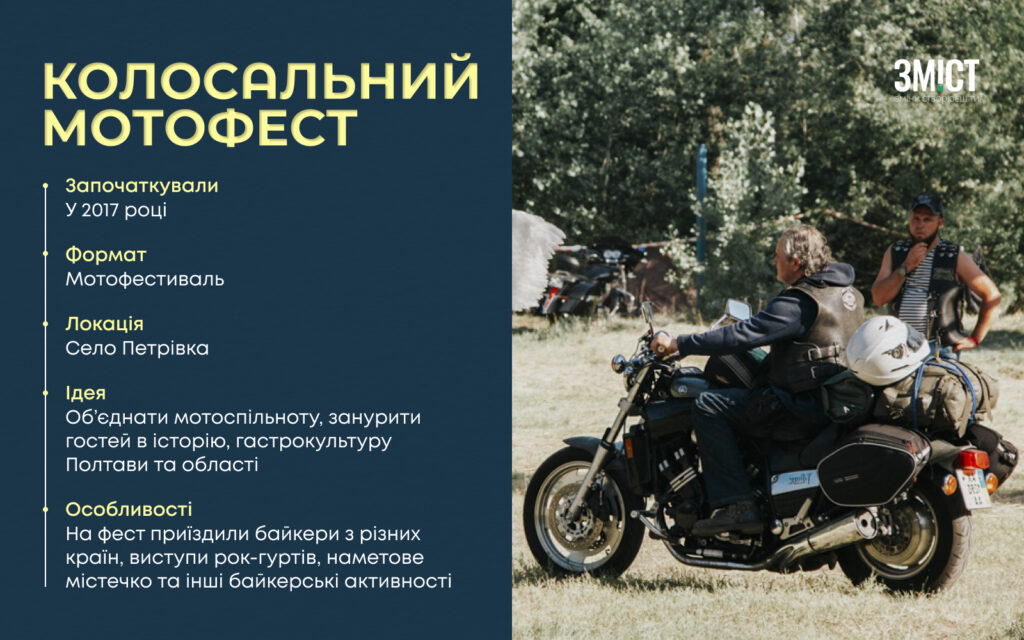 Кілька тисяч байкерів щороку приїздили на Полтавщину, щоб відвідати «Колосальний Мотофест». Вперше захід відбувся у 2017 році.