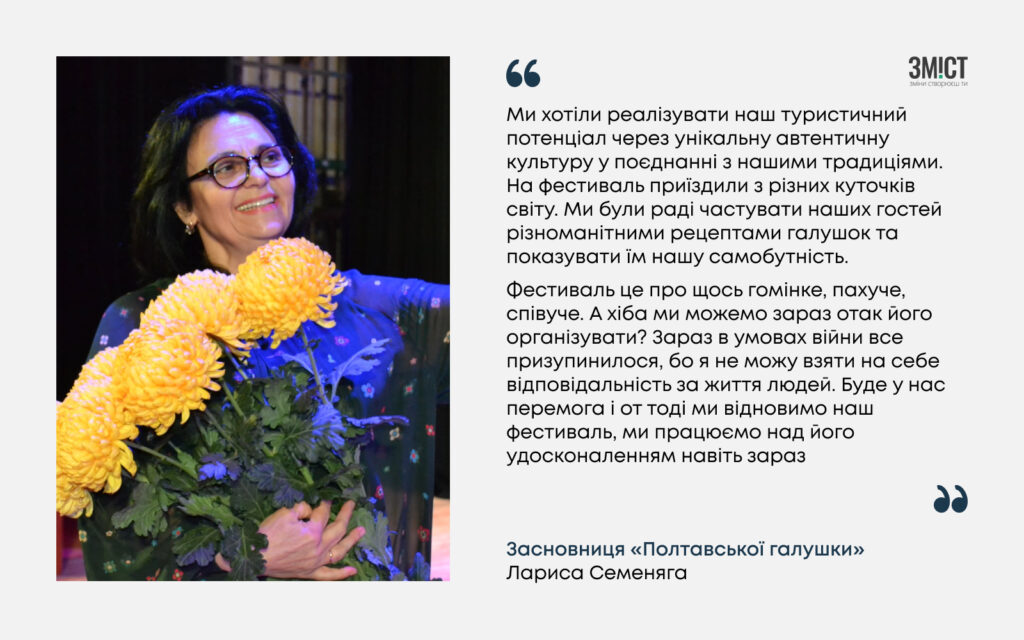 «Коли ми планували цей фестиваль, у нас була мета популяризувати гастрономічний туризм нашої Полтавщини, нашу унікальну автентичну кухню, з її історією та звичаями. Загалом, хотілося зробити культурний бренд нашого міста», – говорить Лариса Семеняга.