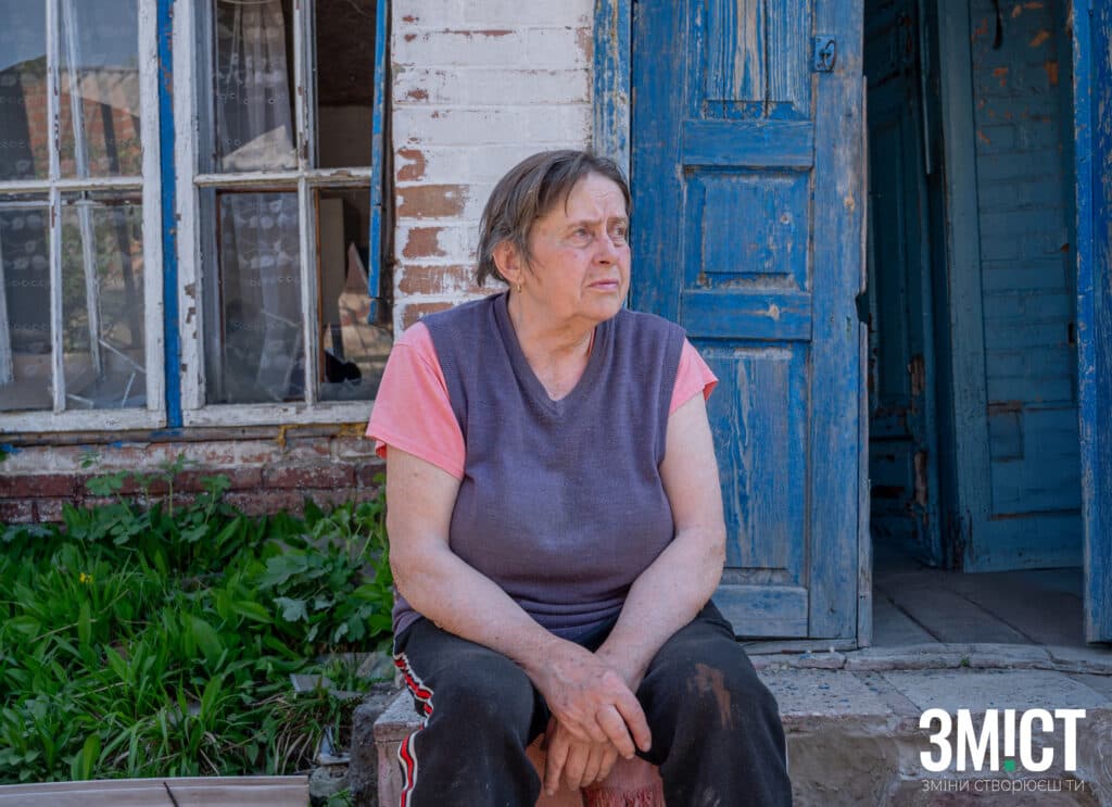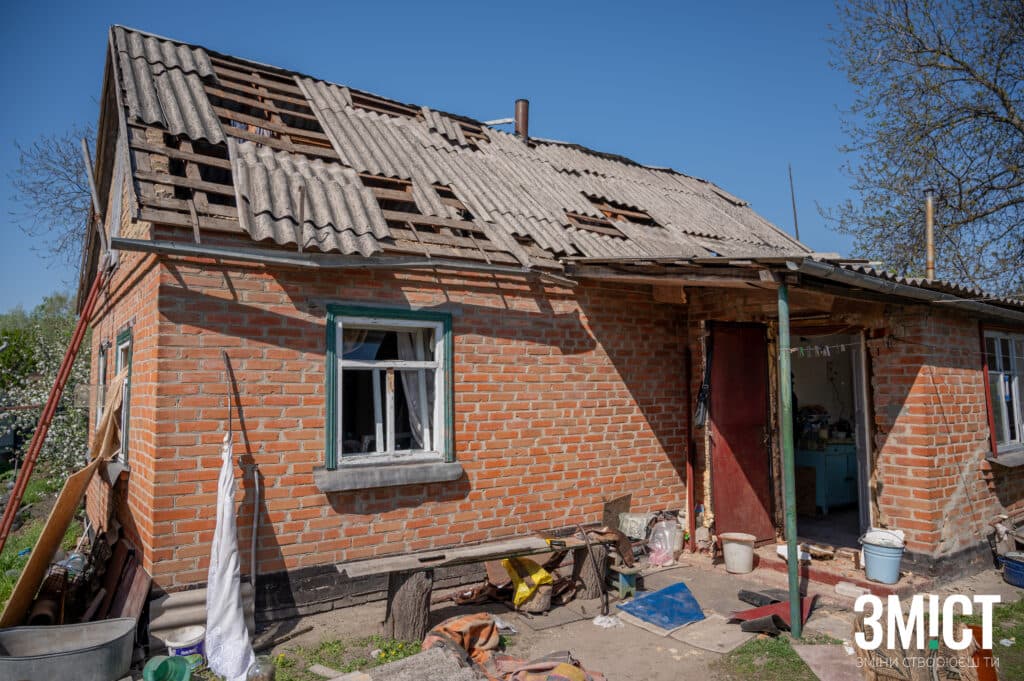 Будинок Олександри Іванівни пошкодило вибуховою хвилею та уламками дронів. Під час обстрілу жінка знаходилася в будинку, де стеля обвалилася в метрі від її ліжка. Розбирати завали жінці допомагають рідні та сусіди.