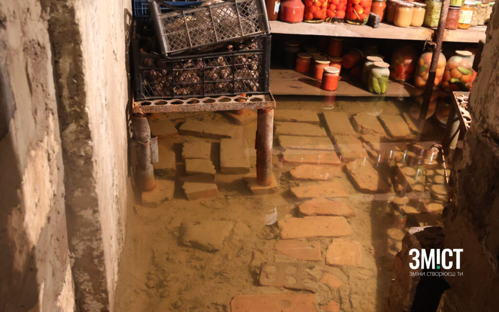 Жителька вулиці Захисників України пані Алла залюбки веде нас до свого льоху, на земляній підлозі якого острівцями посеред води догори дном поставлені металеві миски. Вони затоплені майже до самого вершка.