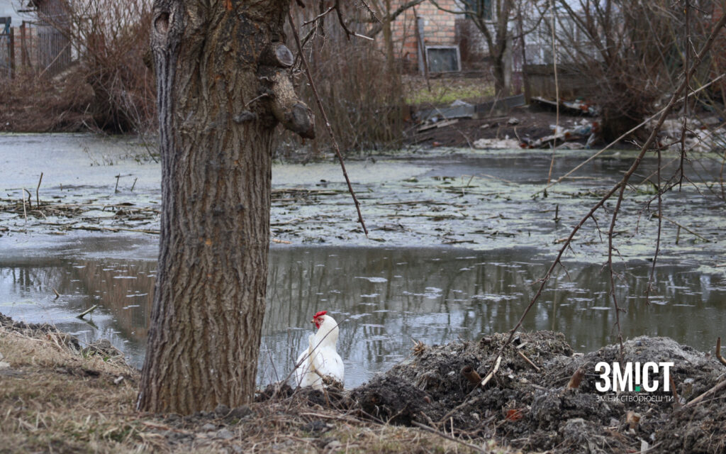 Діставши пораду прогулятися вулицею Корольова, що з іншого боку ставкового каскаду, сходимо з асфальтованої дороги на частково підтоплену ґрунтову. Двори з обох боків ставу розташовані майже впритул до води. У розкиданих на берегах купах садових відходів гребуться кури. Подвір’я порожні, тож користуємося найбільш надійним способом перевірити наявність господарів удома: добряче дратуємо своєю присутністю місцевих псів.
