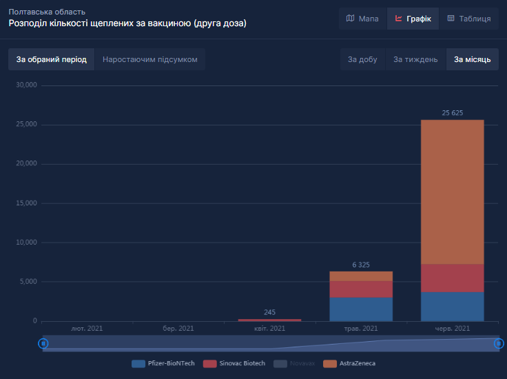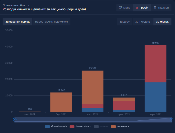 За чотири місяці вакцинації найбільшу кількість щеплень виконали у квітні та червні. Це пов’язано з тим, що у ці місяці відбувалася масова вакцинація населення.