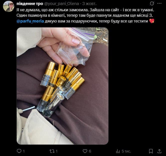 «Я вела блог у соцмережі Х, але він не був спочатку виключно парфумерним. Лише з часом підписники наштовхнули на думку зробити окремий профіль виключно про парфумерію. У 2020 році я створила окремий блог і почала активно туди дописувати».