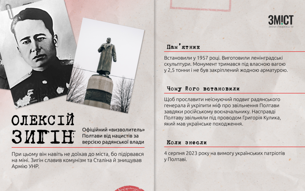 Російська пропаганда зображує Олексія Зигіна «визволителем» Полтави від нацистів, проте мало хто знає, що він так і не доїхав до міста, підірвавшись на міні.