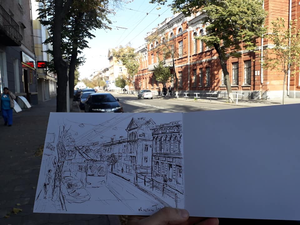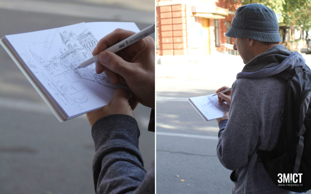 Про те, що ініціативні пирятинці готують альбом історичних замальовок, ЗМІСТу розповів аграрій за фахом В’ячеслав Оропай. Він приїхав на день до Полтави у відрядження, а на дозвіллі вирішив прогулятися містом. Одним із його захоплень є скетчінг, щодо якого чоловік переконаний – навчитися малювати можна навіть без спеціальної освіти. Того дня В’ячеслав Оропай саме робив невелику замальовку вулиці поблизу Полтавського кооперативного коледжу.