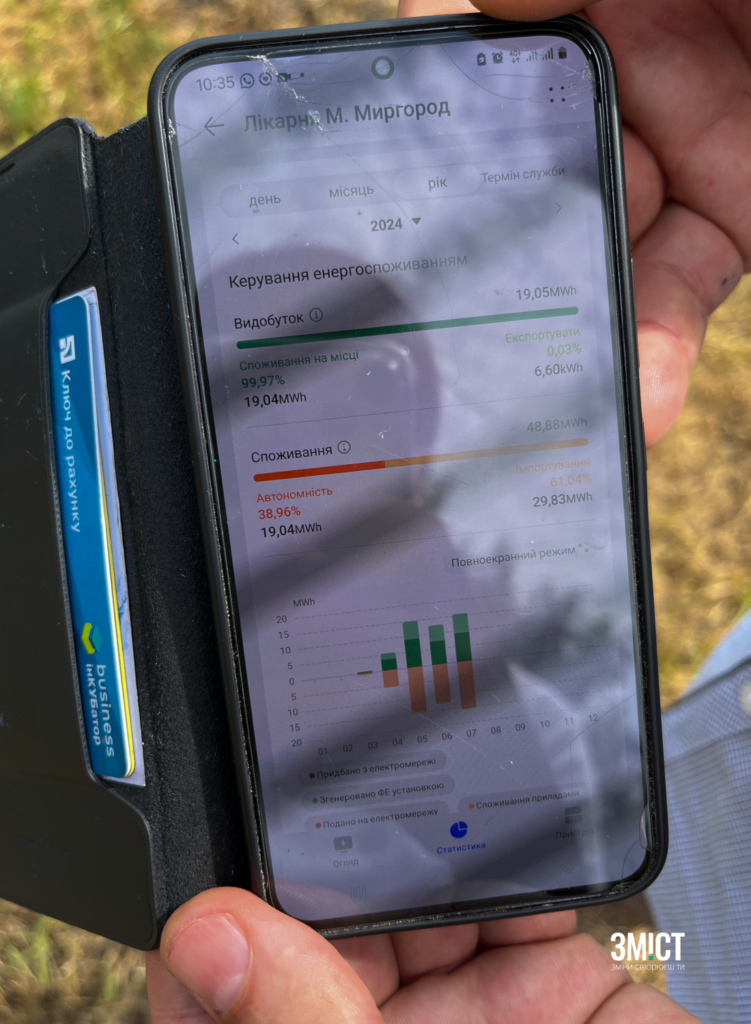 СЕС для лікарні має 96 панелей, які виробляють 37,5 кВт електроенергії при максимальній завантаженості. Показники її роботи можна переглядати просто у застосунку для смартфона, де є статистика за будь-який період роботи. Нині понад третину споживаної енергії лікарня бере з сонячної електростанції, розповідає директор медзакладу Віктор Харченко:
